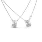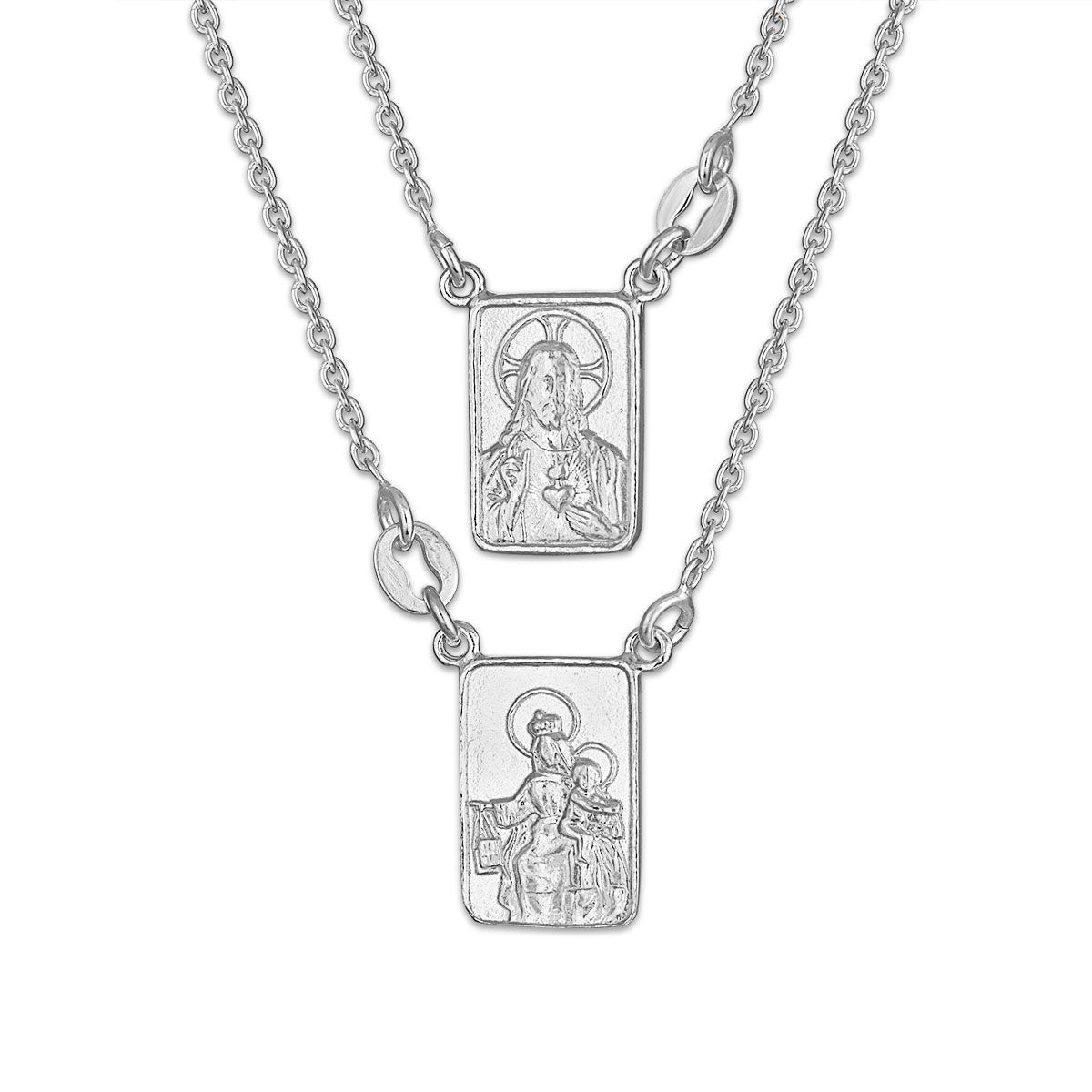 Sophisticated sterling silver scapular necklace featuring two sacred medallions—the Sacred Heart of Jesus on one side and Our Lady of Mount Carmel on the other. Each plaque measures .5" x .37", suspended from a 17-inch chain on each side. Designed to slip over the head without a clasp, this traditional devotional piece rests at chest level with the medallion positioned at the back of the neck. A timeless expression of faith and spiritual protection.