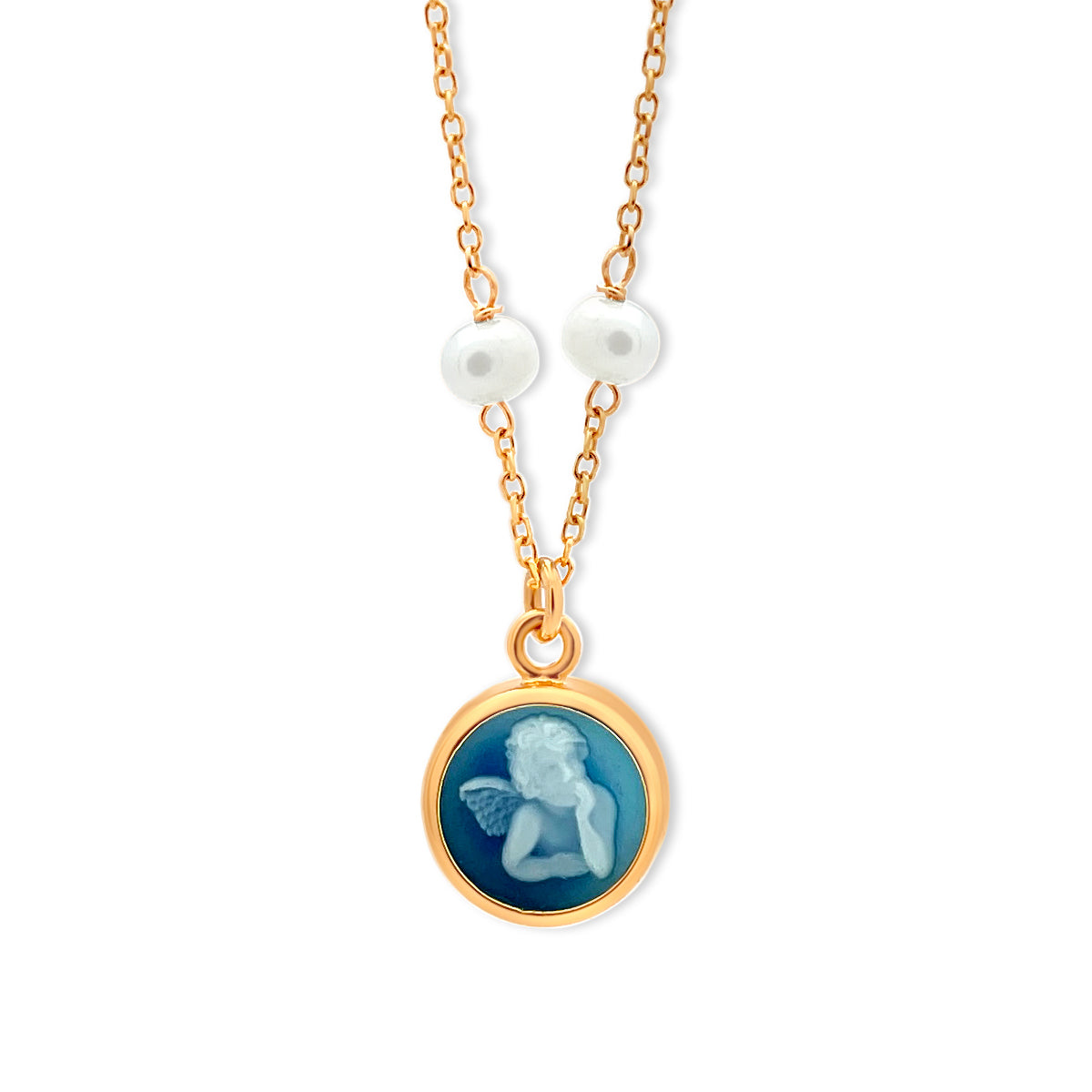 14k Gold Blue Guardian Angel Mini Pearls Necklace
