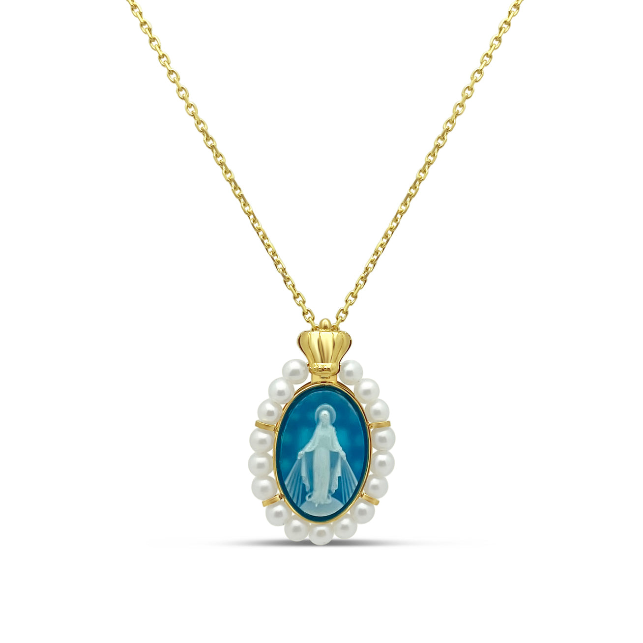 - Cameo carveout made in a natural blue agate stone, reproducing the image of Miraculous Mary Virgen Milagrosa.
